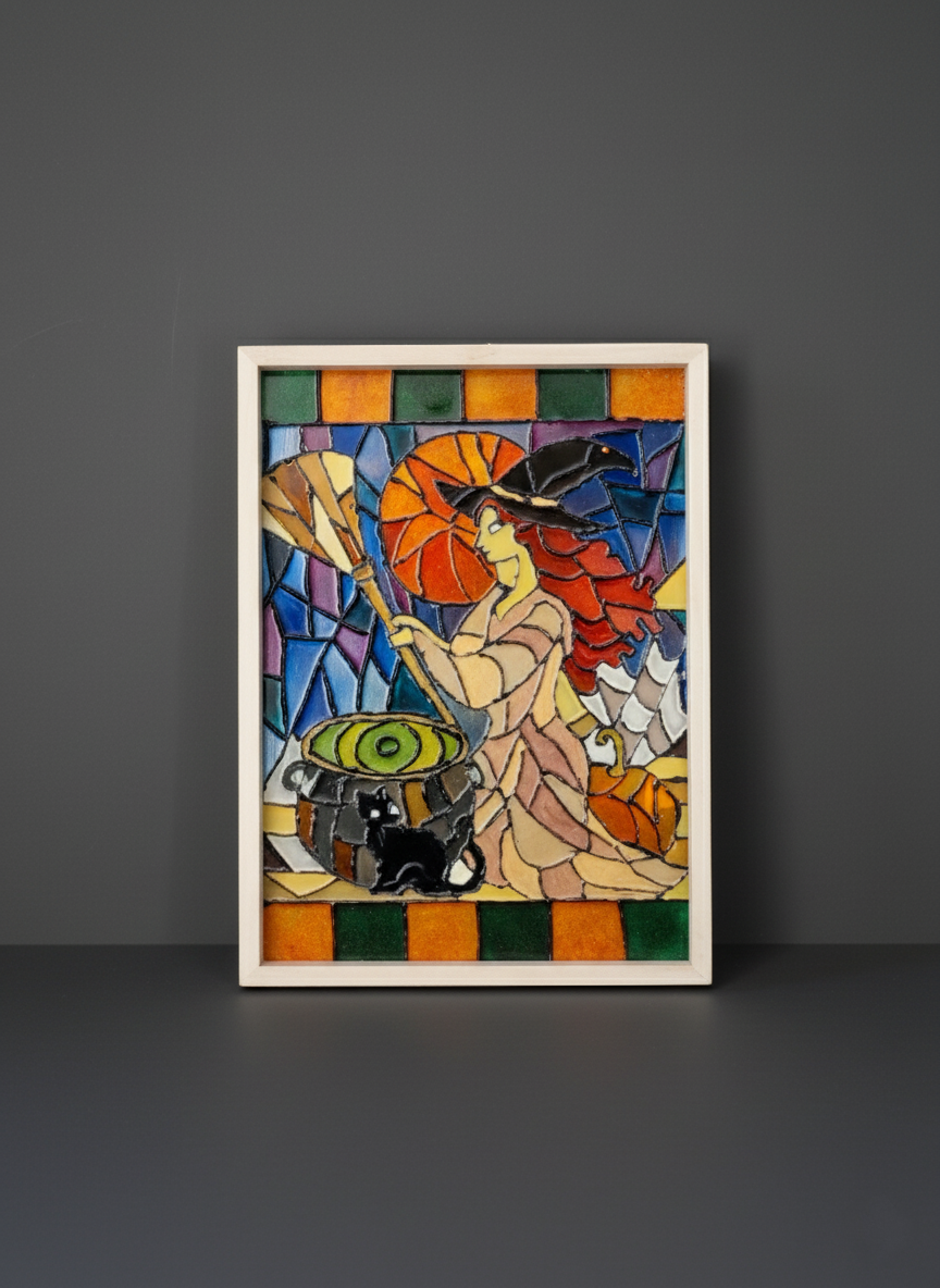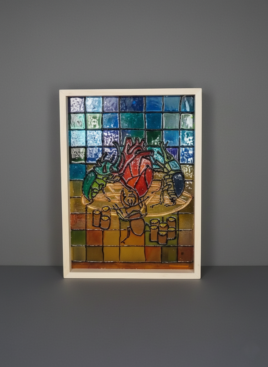 “Rien de plus excitant pour une âme sombre que de jouer avec la lumière et les couleurs. La technique du faux-vitrail me permet de créer une atmosphère unique, dans laquelle l'onirisme du fantastique et les profondeurs abyssales de l'épouvante se matérialisent avec enthousiasme et émerveillement. La peur devient ainsi une source de rêverie. Par mes oeuvres je cherche à partager une approche impertinente de l’horreur gothique, cosmique, de l’épouvante de toute sorte. Chaque pièce ici est unique. Les petites variations de couleur et de trait témoignent du travail entièrement artisanal.”